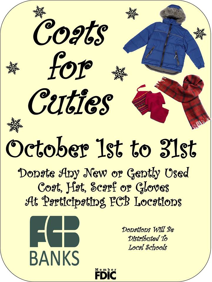 FCB Banks are currently accepting new and gently used coats, hats, scarves and gloves for our annual Coats for Cuties campaign. All items donated will be distributed at local schools. All sizes welcome.