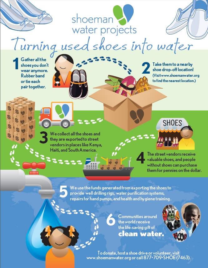 The Shoeman Water Projects pick up donated used and new shoes to give them a second life. Shoeman exports the donated shoes to retailers in the developing world for resale to provide jobs and affordable footwear. For additional information regarding Shoeman Water Project visit www.shoemanwater.org.