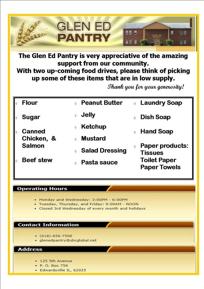 There are several collections for the Glen Ed Pantry coming up. As you are purchasing items for you family, please keep in mind those within our community that the pantry supports and pick up an item that is in need. Thank you for all your support! Please share this post.