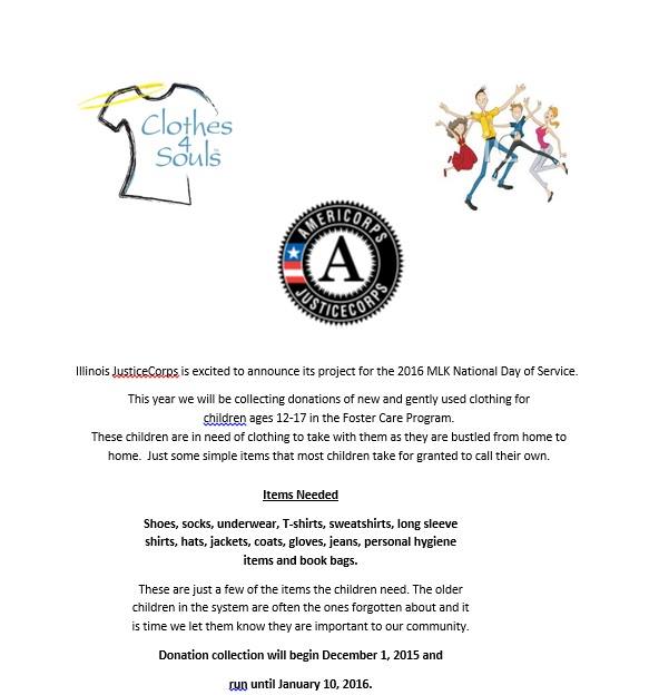 Looking for something for your teens to do over the holidays? Have them clean out their closets! Help the Illinois JusticeCorps celebrate the 2016 MLK Day of Service by donating new and gently used clothing for children ages 12-17 in the Foster Care Program!!!